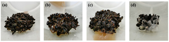 Morphological changes of Limnoperna fortunei during putrid process; ((a)—day 1; (b)—day 3; (c)—day 5; (d)—day 10).