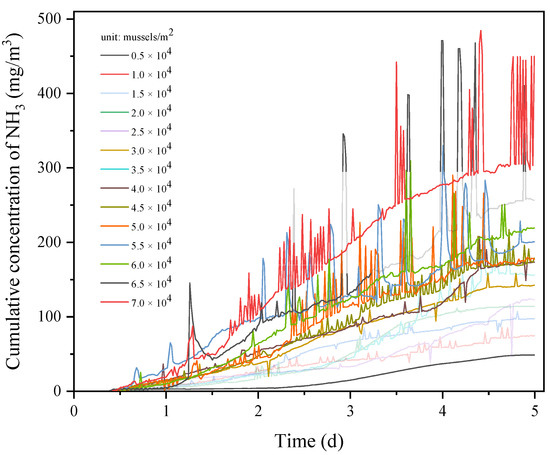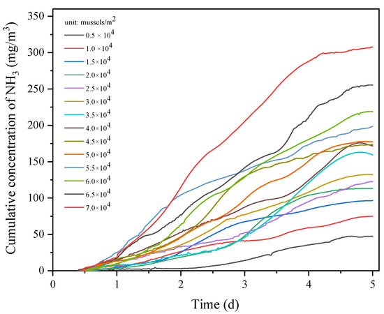 The exposure limit of NH3 is 30 mg/m3 as defined in Occupational exposure limits for hazardous agents in the workplace-chemical hazardous agents (GBZ 2.1-2007, 2007) [32] and other relevant specifications. In this experiment, the concentration of NH3 in Limnoperna fortunei with a density of 6.0–7.0 × 104 mussels/m2 reached the contact limit on the first day after the Limnoperna fortunei was out of water. On the second day out of water, the concentration of NH3 in Limnoperna fortunei with a density of 4.5–5.5 × 104 mussels/m2 reached the contact limit. On the third day out of water, the concentration of NH3 reached the contact limit for all Limnoperna fortunei with a density of 0.5–4.0 × 104 mussels/m2. In particular, NH3 concentration reached the highest detected value of 307.9454 mg/m3 when the density of Limnoperna fortunei was 7.0 × 104 mussels/m2 and the time in water was 4.8 days. It can be seen that the concentration of NH3 released during the spoilage of Limnoperna fortunei can reach the level of health and safety threat to workers in a short period of time, and the cumulative concentration of NH3 is far beyond the exposure limit with the increase in the time when Limnoperna fortunei are away from water. Therefore, the influence of NH3 pollutants should be considered in the spoilage and pollution control of Limnoperna fortunei.