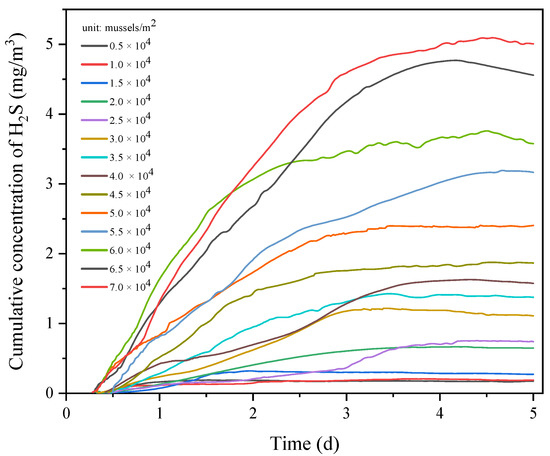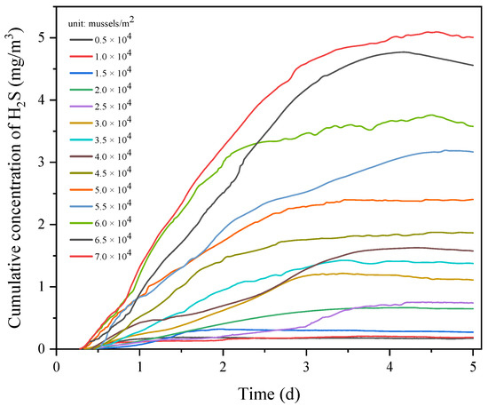 The change of H2S concentration released by Limnoperna fortunei at different densities is shown in Figure 12. The maximum H2S release concentration was higher when the density of Limnoperna fortunei was higher. When the number density of Limnoperna fortunei was 0.5–1.5 × 104 mussels/m2, the release concentration of H2S was maintained at a low level throughout the whole process of spoilage, and the maximum concentration was not more than 0.3221 mg/m3. When the density of Limnoperna fortunei reached 2.5 × 104 mussels/m2, the release concentration of H2S increased exponentially, with the density increasing from 0.7552 to 5.0946 mg/m3. In general, the median H2S concentration increased with the increase in Limnoperna fortunei density, which may be related to the early release of H2S in f Limnoperna fortunei.