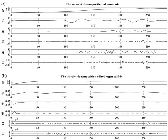 Decomposition of NH3 (a) and H2S (b) concentration data by db5 wavelet.