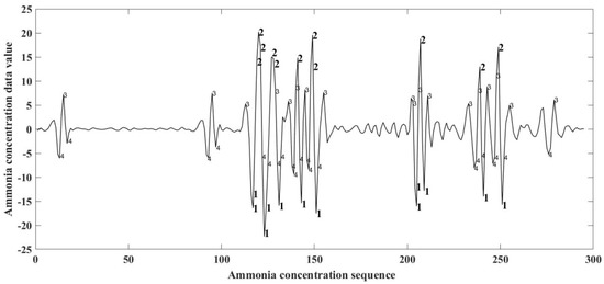 For gas concentration, the outliers are usually abnormally large or abnormally small. Any outliers will affect the quantitative analysis results of harmful gas release characteristics of Limnoperna fortunei, so the outliers in the gas concentration data set were comprehensively identified in this paper. By combining the analysis of the working state of gas monitoring equipment (sensor stability, drift, and failure) and the performance of original sequence data, it is judged that when the number of K-means algorithm clusters is 4, it can not only explain different data conditions but also ensure the stability of clustering results. The identification results of outliers by the K-means algorithm are shown in Figure 8. The abnormal small values in the concentration of harmful gas are reflected in clusters 1 and 4, and the abnormal large values are reflected in clusters 2 and 3. Among them, cluster no. 1 in the figure is an obviously abnormal small value, and cluster no. 2 is an obviously abnormal large value, which should be directly deleted. Cluster no. 3 and cluster no. 4 are fuzzy outliers, which can be retained or continued processing. By analyzing the overall fluctuation of the sequence, it was empirically determined that cluster 3 and cluster 4 were abnormal data caused by sensor drift, which may affect the accuracy of subsequent quantitative analysis of harmful gas concentration, so it was also deleted.