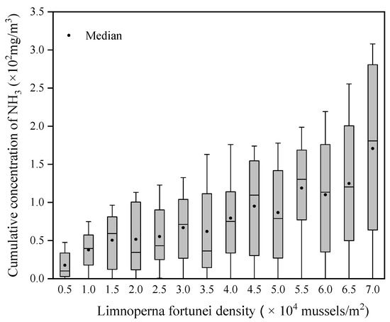 The change of NH3 concentration during the purification of Limnoperna fortunei is shown in Figure 11. The higher the density of Limnoperna fortunei, the higher the maximum release concentration of NH3. Especially when the number density of Limnoperna fortunei reached 5.0–7.0 × 104 mussels/m2, the maximum NH3 release concentration increased linearly with the increase in Limnoperna fortunei density, from 177.7673 to 307.9454 mg/m3. The fluctuation of the median NH3 concentration showed no obvious regularity with the change of density of Limnoperna fortunei, indicating that the rate of harmful gas release from the putrification of Limnoperna fortunei was unrelated to the density of Limnoperna fortunei, which may be caused by the individual difference of Limnoperna fortunei putrification and the complexity of microbial reaction.
