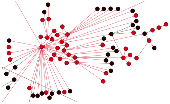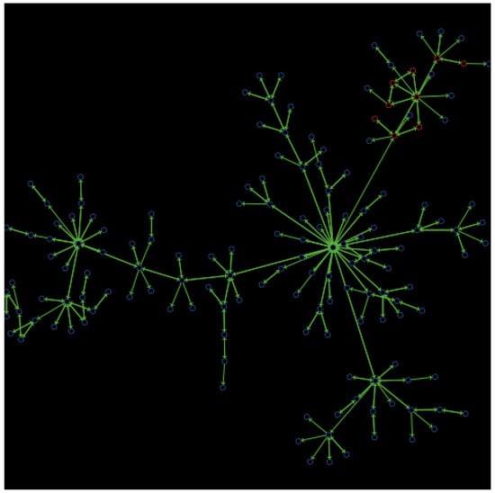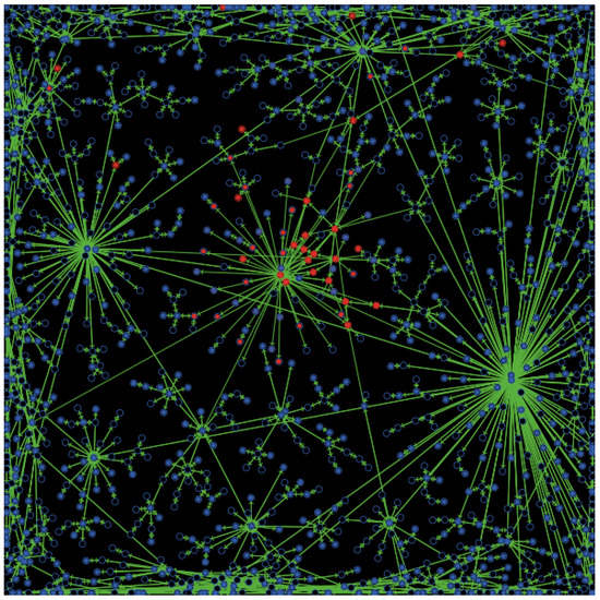 As introduced by Section 4, the simulation is conducted in two phases. First, the network construction phase (see Section 4.1) is run until rounds (ticks), which creates a network with about as many user nodes (more precisely, since we start with an initial network of two nodes and we add one network node per round, then the network finishes this phase having a size of nodes). Then, our opinion dynamics phase from Section 4.2 starts so that the network is grown for further 1000 rounds. Figure 7 depicts a screenshot of opinion diffusion in our simulation where both hateful and non-hateful posts are being distributed. Both posts and reposts are represented as solid circles, so our visualization (the graph layout algorithm is based on the Fruchterman–Reingold layout algorithm [50]) does not distinguish the publishing of original content from its subsequent reposting. Moreover, the direction of links indicates influence: we signal that a followee user A influences its follower B by a directed arrow (i.e., a link in the model) that goes from A to B. Thus, the amount of out-going links (i.e., the out-degree) of a user node corresponds to its amount of followers.