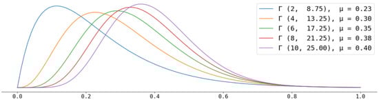 Additionally, education can introduce an initial bias into the view of the population, e.g., by teaching democratic values and human rights [9]. However, rather than modelling how this positive bias is actually introduced (i.e., how education is implemented in the society), we can simply model its effect by skewing the hate score distribution used in the creation of the society. The mean value of the whole distribution should then move into the direction of non-hateful persons, hence decreasing the tendency towards the hatred. However, we assume that, despite the educational bias on the majority of the population, the group of very hateful persons will still be present in the population with the same proportion. So, the parameters of the Gamma probability distribution are adjusted in such a way that the fraction of hateful persons stays invariably ca. 1% but their mean values are decreased. Figure 5 shows the baseline distribution and four further distributions with their corresponding mean values which vary from down to . In this manner, we do not model how the positive bias is introduced into the population but take it for granted and simply apply the bias (i.e., the positively-skewed alternative distributions in Figure 5) to the population during the network construction phase (see Section 4.1).