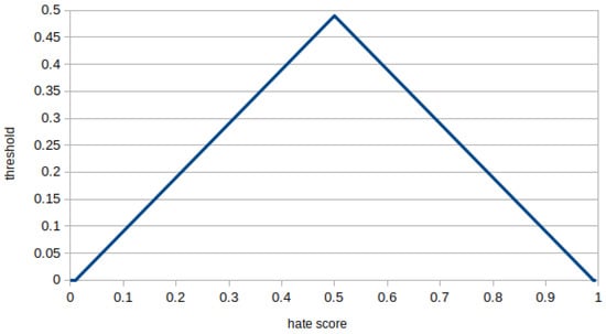Here we reuse the concept of confidence level, a threshold for opinion difference, defined in the Hegselmann–Krause (HK) model [29] and introduced in Section 2.2. Following the ideas of the heterogeneous HK model, we define the threshold for accepting the opinion of other users tailored for every user i depending on their hate score. The assumption is that: (i) extreme users tend to have rather fixed opinions, which cannot be changed by any influence; and (ii) alternatively, those with a middle hate score may be more open to accept opinions that differ from their own, and in fact could be still dragged to one of the extremes. Figure 6 depicts the function used for the threshold: extreme left and right sides of the possible hate score values exhibit fixed opinion (i.e., with a threshold of 0) whereas median users have a threshold of 0.49.