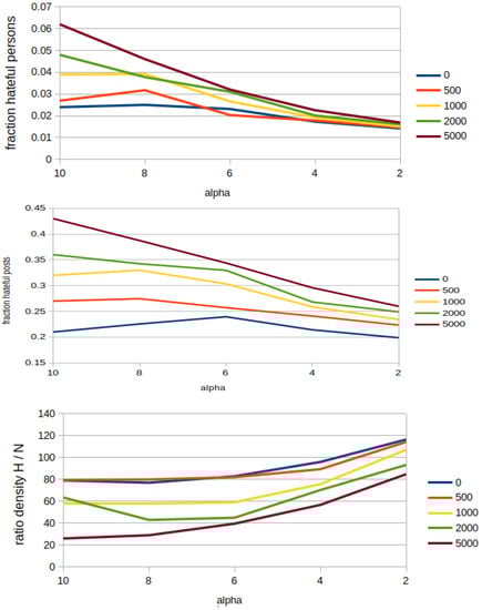 Our simulations show that the effect of this countermeasure is two-fold. On the one hand, considering the fraction of hateful persons, we can observe, from the top of Figure 8, that if we take as reference the hate scores set when in the Gamma distribution, then, all subsequent (lower) values imply a substantial decrease in the amount of hateful persons, even if they are not completely removed from the society. Indeed, even with the strongest educational bias, which sets and reduces the fraction of hateful persons below 0.02 for all the considered network sizes, the amount of haters does not fall below of 1%. Similarly, as shown in the middle of Figure 8, the amount of hateful posts decreases down to below 0.27 for all network sizes when . Additional tests show that the risk of swaps to a hateful society drops from 25% below 5% for the values of for all network sizes. These tests also show that the mean hate score have similar values for all network sizes and steadily decrease from ca. 0.4 for the original Gamma distribution (i.e., with ), down to a ca. 0.1 for . This can be explained by the structure of the network that results from using preferential attachment, where some nodes have unproportionally higher influence. Hence, applying a skewed distribution upon it can skew the final distribution even more after opinion diffusion.