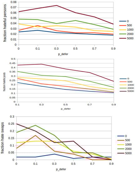 As Section 5.2 details, the simulations aimed at studying the effect of deferring hateful content are conducted by varying the deferring probability and considering that a value of 0.7 deems realistic if we take into account the state-of-the-art accuracy in recognition of hate speech [51]. The obtained results show that, compared to the education, this countermeasure is less successful in decreasing the fraction of hateful persons as can be seen on the top of Figure 9, where a value of as high as 0.9 still results in a fraction of hateful users that varies from the ca. 4% for the largest network size down to a fraction of ca. 2% for the smallest one. Surprisingly, we can even observe some kind of reluctance and increase for . As the middle of Figure 9 depicts, something similar happens with the fraction of hateful posts for the largest network size (i.e., 5000), although the main tendency for all the network sizes and probabilities is to decrease values.