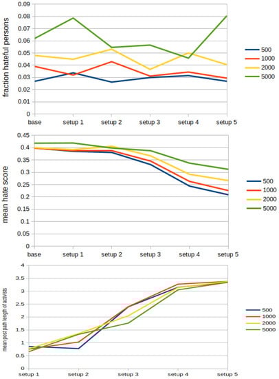 Effects of counter activists as countermeasure for different network sizes (0, 500, 1000, 2000, 5000) and for the five different setups from Table 2: (Top) fraction of hateful users; (Middle) mean hate score; (Bottom) mean path length of activists’ posts.