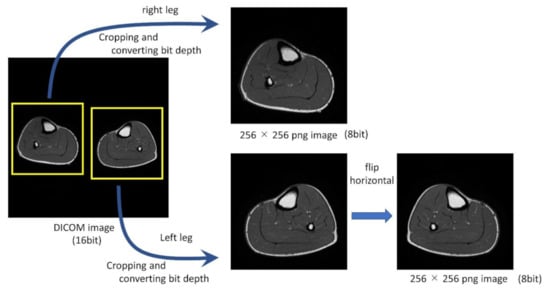 For supervised image creation, the DICOM images were converted to 8-bit using the MATLAB (The MathWorks, Inc., Natick, MA, USA) “mat2gray” function because the bit depth of DICOM images is 16-bit. Those with only one leg captured were resized to 256 × 256 portable network graphics (PNG) images, whereas those with both legs captured were trimmed to the appropriate size for each leg and resized to 256 × 256. The left leg was reversed and oriented in the same way as the right leg (Figure 1). The coordinates of the trimmed area were also recorded to estimate the pixel size and the number of pixels in a trimmed image for volume calculation. Images of 67 leg muscles were obtained from 38 patients. The trimmed images were used for training and evaluation.