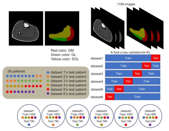 These images were saved as PNG images by dividing the triceps into three classes (GM, GL, and SOL) with an in-house MATLAB software; the regions of interest (ROIs) were also manually defined (Figure 2). The ROIs were manually defined by the author alone and were then verified by two radiological technologists with 5 (T.Y.) and 20 years of experience (H.S.), respectively. A total of 1199 images were prepared from 38 patients, and the Train:Test was set to 10:2. The 38 patients were classified into six groups, and six datasets were created so that one could be used as a test (Figure 2). Six different datasets with 1199 images were prepared for K-fold cross-validation so that the number of tests would be approximately 200. Data augmentation for improving the training [6] was performed on the training images, and they were rotated by 5° from −45 to 45°, increasing the number of images by 19 times.