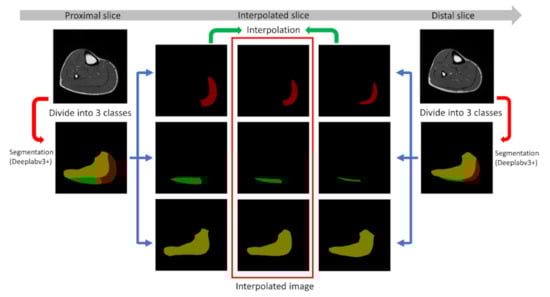 Deep learning technology has been widely used in recent years for automatic driving, drones, weather forecasting, and games [1,2,3,4]. The deep learning techniques include classification [5], object detection [6], and semantic segmentation. Semantic segmentation has been used to visualize the three-dimensional (3D) anatomical structures of multiple organs in 3D computed tomography images [7], to facilitate the quantitative coronary angiography-based diagnosis of major vessels in X-ray coronary angiography [8], and to quantitate whole breast image analysis in diffusion-weighted images [9]. An applied method using Conditional Generative Adversarial Networks (cGANs) has been reported [10] to be highly accurate for in segmenting peri-knee tissue using magnetic resonance imaging (MRI). These techniques are used in various body parts and modalities. This study focused on semantic segmentation of the triceps surae muscle, which consists of the gastrocnemius and soleus (SOL) muscles. The gastrocnemius is a biceps muscle that comprises the gastrocnemius lateralis (GL) and gastrocnemius medialis (GM). The triceps is an important muscle because it makes activities, such as walking and standing, possible by its repeated contraction and relaxation. Triceps muscle weakness increases the risk of falling and prevents these essential activities [11]. The muscle volume is commonly used as a measure of the muscle size, and it is frequently measured in studies because it correlates with various functional parameters [12]. In a study by Thom et al., the volume of the triceps femoris muscle was calculated to assess the loss of muscle mass with aging [13]. The volume was calculated by the product of the cross-sectional area and slice thickness obtained by manual segmentation using an imaging software; however, this procedure takes a long time [14]. Friedberger et al. [15] showed that it is now possible to perform semi-automatic volume calculations using the Random Forest classifier for hand muscle segmentation. However, this method is still semi-automatic, and even though it reduces the effort of manual segmentation, it still requires modifications and is significantly time-consuming. In addition, since magnetic resonance imaging of the lower extremities is often performed with thicker slices and more spacing between images, volume calculations using only the acquired images are likely to differ significantly from the actual volume. Therefore, it was believed that by slice interpolating the MRI images and calculating the volume using the interpolated images, this difference from the actual image could be reduced.
