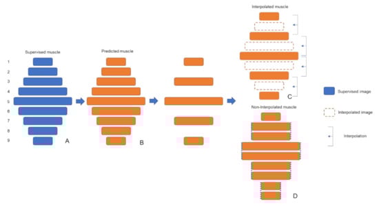 Creating the interpolated images from the predicted images based on the presence or absence of muscles in the supervised images. (A) Muscles in supervised images; (B) Predictive muscles using segmentation model; (C) Interpolated muscles using the interpolation method by thinning out the even number of predicted images; (D) Muscles with even-numbered predicted images thinned out and slice thickness doubled without using the interpolation method; 1–9; The number of the slice where the muscle is located.