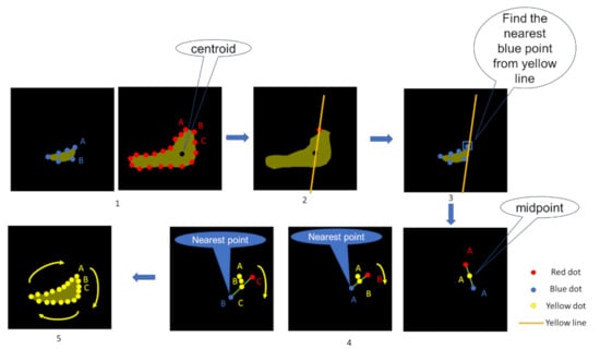 Procedure of interpolation: (1) The outline with dots and the calculated centroid of the muscle with the most dots were expressed; (2) a line was drawn connecting the red dot and the centroid; (3) measured the distance between all the blue points and the yellow line, found the nearest blue point from yellow line; (4) the midpoint of the red dot and the selected blue dot was marked; (5) a different red dot was selected and steps 2 through 4 were repeated for as many red dots as there are red dots, connecting all the yellow dots.