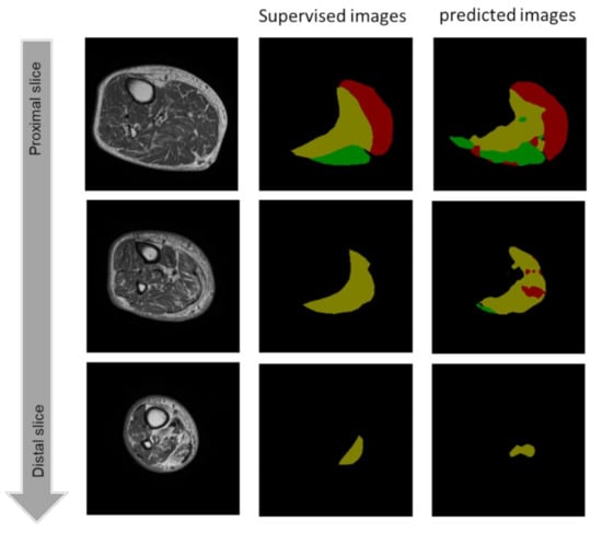 The error rates of volume per dataset are shown in Table 3. The following table shows the error rates of the volumes of all 67 legs that were present in the supervised and predicted images. The total error represents the error rate of all three muscle volumes. The error rate of MG, SOL, and sum was 10% but that of the GL volume was large.