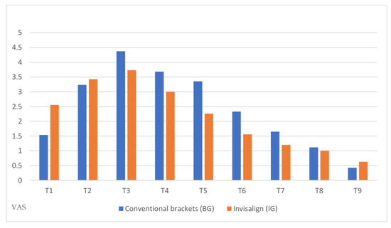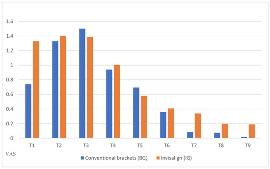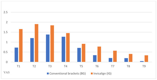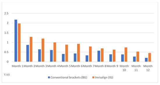 The novelty of this study was to evaluate patient pain scores on the visual analog scale each month during a follow-up period of 12 months while comparing conventional brackets and aligners (Invisalign) and, at different time periods of each month, to analyze the pain described by the patients.