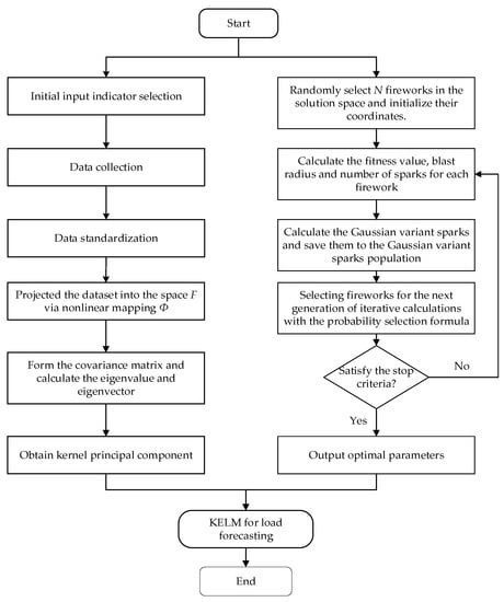 As a new feedforward neural network, extreme learning machine (ELM), which overcome the defects of traditional BPNN and SVM, has been applied in a number of prediction areas and has obtained more accurate prediction results [16,17,18] for reducing the risk of falling into the local optimality. Since ELM has poor predict stability because of the characteristics of random initialization of inputting weight and hidden layer offset, Guangbin Huang et al. [19] introduced a kernel extreme learning machine (KELM) algorithm, which overcomes the weakness of poor stability of ELM and improves the learning accuracy of the algorithm. However, the performance of KELM is easily affected by the penalty coefficient C and the kernel parameter σ, therefore KELM needs to be solved by intelligent algorithms for parameter optimization with regard to the problems of difficult selection for these two parameters. The inspiration of fireworks algorithm comes from the explosion of air fireworks, which is a new type of swarm intelligence algorithm with global optimization solution of explosive search mechanism, shows great accuracy and high efficiency when solving complex optimization problems [20]. Thus, FWA to be selected for optimizing the parameters of KELM in this paper.