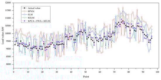 For the sake of proving the forecasting accuracy of the proposed DES load forecasting method, this paper also selects the KELM, ELM and BPNN which are not optimized by FWA to forecast the load data of this sample, and then evaluates and analyzes the prediction results of the four methods. The structure of the BPNN model is 6-3-1, whose hidden layer transfer function is expressed as “tansig” function, while the output layer transfer function is expressed as purelin function, with the maximum time of training being 300, the minimum error of training objectives being 0.0001, the rate of training being 0.1, and the original weight and threshold values derived from the model’s own learning. In the ELM method, the penalty parameter obtained from training C is 10.276 and the kernel parameter σ is 0.0013. In the KELM model parameters, C is 10.108 and σ is 0.0026.