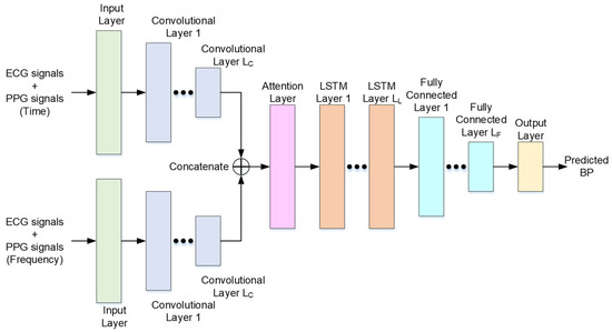Recently, deep learning had been successfully applied in many applications, and then much research had been proposed to accurately estimate BP [10,11,12,13,14,15]. Wu et al. used a backpropagation neural network and radial basis function to estimate the BP. However, the backpropagation neural network has weak generalization ability [10]. Wu applied deep learning and human physiological characteristics to estimate BP, which can obtain better results compared with backpropagation neural networks [11]. However, it has high computational complexity and is not suitable for real-time applications. Baek et al. proposed a convolutional neural network (CNN)-based BP estimation model, which processes sequential ECG and PPG signals for estimating BP [12]. However, the CNN-based BP estimation model did not use the time-serious information of ECG and PPG signals. Therefore, Argha used long short-term memory (LSTM) to improve the performance of the BP estimation [13]. Nowadays, CNN-LSTM has been developed to combine the advantages of CNN and LSTM. CNN-LSTM can estimate BP by using ECG and PPG signals [14,15], but these methods are still not convenient enough. To improve the performance of CNN-LSTM, an attention mechanism had been proposed and applied to many applications [16,17]. Therefore, integrating the attention mechanism with CNN-LSTM can efficiently increase the accuracy of BP estimation.