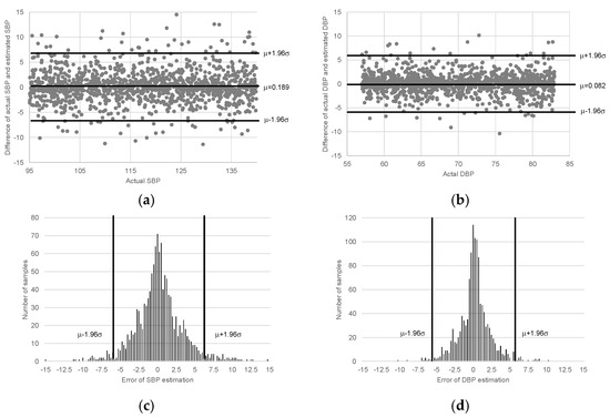 Bland–Altman plots of (a) SBP and (b) DBP and error distributions of (c) SBP and (d) DBP.
