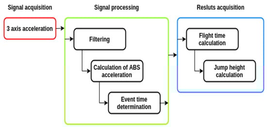 The methodological approach to the JH calculation is summarized in Figure 1. In the signal acquisition phase, the raw signal of acceleration is acquired for the X, Y and Z axis. The signal processing phase combines the filtering of the raw signals, followed by the calculation of the absolute acceleration and event detection. After that, in the final step, the flight time is calculated from the timestamps of the obtained events (take-off and landing) and the jump height is calculated from the determined flight time by Equation (1).