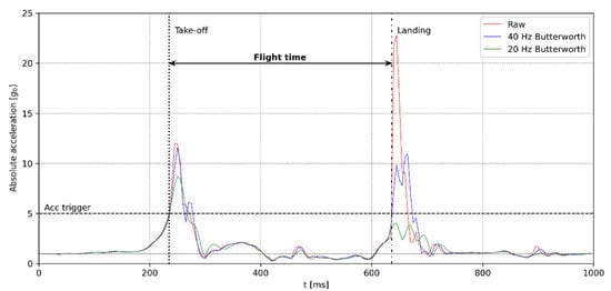 Taking into account the sampling frequency of 200 Hz, it should be noted that the analog acceleration signal is filtered in the LMS6DS33 chip with a 100 Hz low pass anti-aliasing filterer, as defined in the manufacturer’s datasheet [30]. In addition, the acquired signal was filtered using a Butterworth low-pass filter (order = 5, fcof = 40 Hz). A much lower filter cut-off frequency (fcof = 10 Hz) is commonly used in the processing of signals obtained on different human movements, which is aimed towards the elimination of the signal components originating from external factors. However, for the purposes of VJ height estimation, such an approach is inappropriate in relation to the landing phase of the jump in which the athlete’s body collides with the surface thus providing an intensive jerk and high acceleration values which can exceed the sensor threshold. Figure 2 shows the detection of take-off and landing events using 5 g0 threshold on raw and signals filtered using 40 and 20 Hz fcof (red, blue and black, respectively). Due to the signal being filtered in A/D conversion it can be noted that even raw signal can be used for event detection. However, as the external conditions of in-field measurement may vary additional filtering is implemented. Reducing acceleration signal spectra under 40 Hz introduces errors in detecting the landing event, which can be clearly seen in Figure 2.