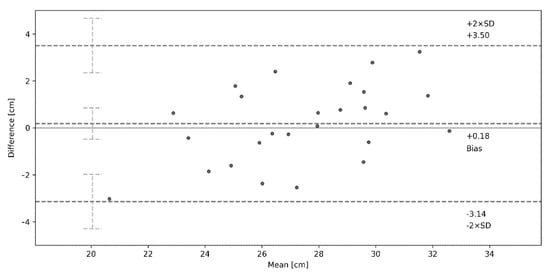 Table 2 summarizes the results of the validity analysis of the VJ height measurement using an individual IMU placed on the metatarsal part of the foot versus an FP as a criterion device. Regarding the CMJ, the difference in the JH results calculated from FP and IMU data was not statistically significant (t = 0.897, p = 0.379). The Cohen’s d of 0.176 indicates a negligible difference in the results between the two devices, which is further supported by the McV value of 1.896. The Bland–Altman analysis yielded a bias of −0.18 cm and 95% LOA of −2.26 to 1.9 cm. The determined ICC value was 0.975. In relation to the SQJ, the difference of the JH results calculated from FP and IMU data was not statistically significant (t = −0.564, p = 0.578), with a negligible effect size of 0.111. The determined McV value was low (3.556) while the ICC value was 0.921. The Bland–Altman analysis yielded a bias of 0.18 cm and 95% LOA of −3.14 to 3.5 cm.