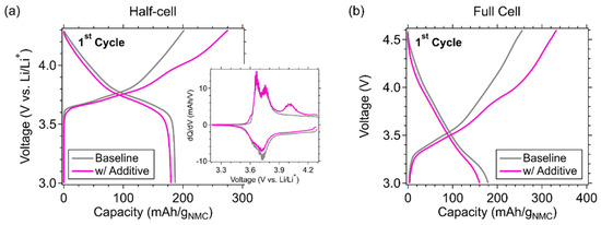 (a) Half-cell and (b) full-cell profiles of the baseline and the additive Li2O + Co3O4 @1100 rpm containing electrodes during the first cycle. Half cells and full cells were charged at a C/20 rate up to 4.3 and 4.6 V, respectively. Voltage profiles are plotted as a function of grams of NMC in the electrode, excluding the mass of additives. dQ/dV plots for half cells are shown as an inset of (a).