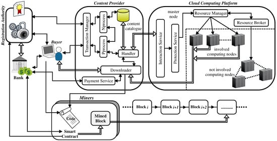 The proposed protocol involves the following entities, each one playing a specific role: (1) the content provider releases only encrypted and watermarked contents; (2) the buyer decrypts the received content to obtain it in the final, protected form; (3) a blockchain automatically runs smart contracts to validate the purchases of protected digital contents occurring between buyers and content providers; (4) a cloud computing platform can be delegated by the content provider as an infrastructural service provider [20] to implement watermark insertion; (5) a “registration authority” guarantees the security tokens employed in the purchase transactions; (6) a judge participates in the dispute resolution protocol to determine if a buyer is guilty of having released pirated copies.
