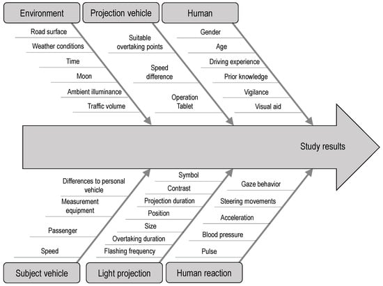 Figure 1 shows various factors influencing the study, divided into six categories as an Ishikawa diagram [63]. For reproducible study results, it is essential to exclude as many influencing factors as possible, to keep them constant, or at least to limit them.