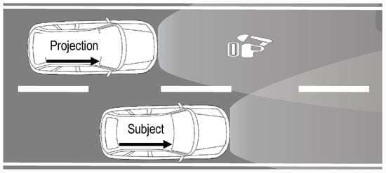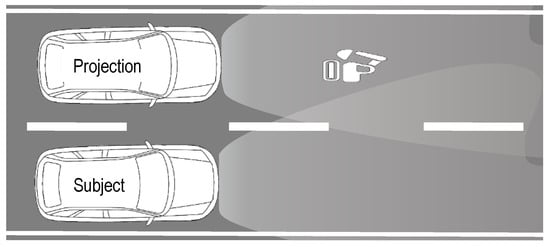 The projection vehicle, which is commercially available in luxury class cars, is equipped with a DMD-based projection system. The projection system is integrated into the headlamp. The projection vehicle overtakes the subject vehicle with a constant speed of 115 km/h (±5 km/h) in the adjacent lane, which gives an average differential speed of approximately 15 km/h.