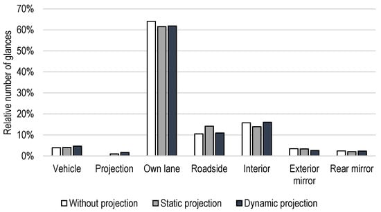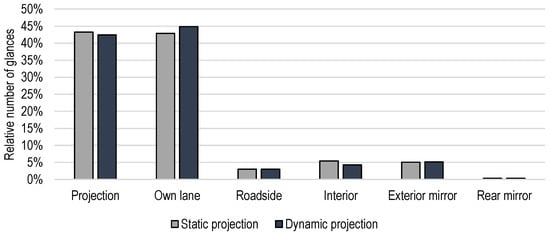 Figure 6 shows the relative number of glances to the individual areas of interest (AOI). The glances at the red AOI “projection area” (see Figure 5) are divided into glances at the projection vehicle itself and glances in front of it when a projection is switched on. In the second case, looking at this area offers the possibility to see the on-road projection.
