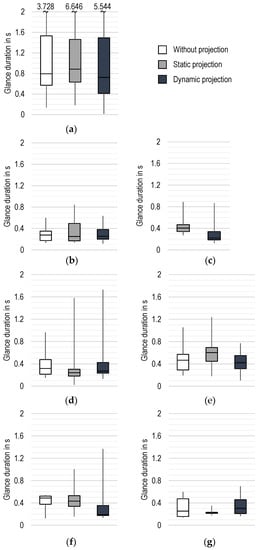 Boxplots of the glance time while overtaking maneuvers on the (a) own lane (bars are cut off), (b) projection vehicle, (c) on-road projection, (d) right roadside, (e) interior, (f) left exterior mirror and (g) rear mirror.