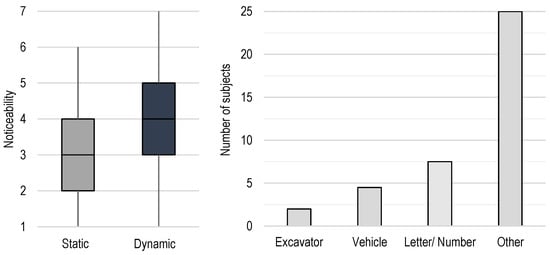 (Left) Boxplot of the noticeability of the projections evaluated by the subjects. (Right) Number of subjects who assigned the projection to an object category.
