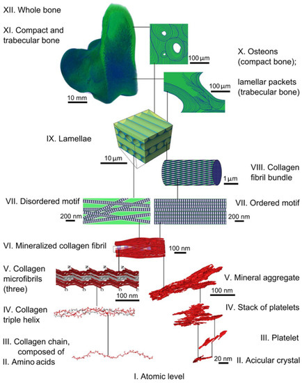 - Reznikov, N.; Bilton, M.; Lari, L.; Stevens, M.M.; Kröger, R. Fractal-like Hierarchical Organization of Bone Begins at the Nanoscale. Science 2018, 360, eaao2189. [Google Scholar] [CrossRef] [PubMed]