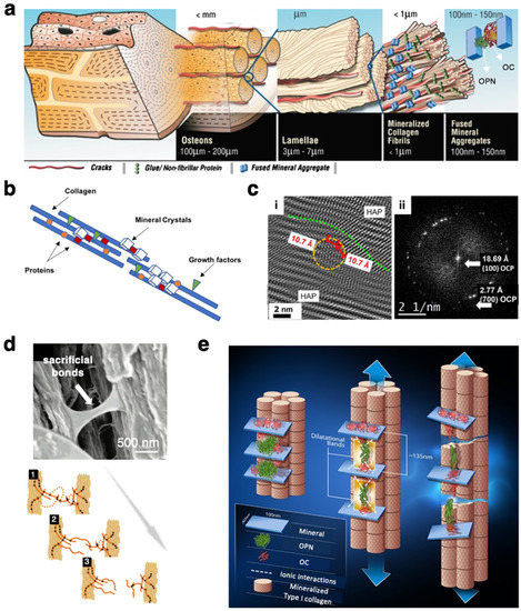 Non-collagenous proteins in bone. (a) A model depiction of matrix proteins OC–OPN complexes within the structural hierarchy of bone. Not to scale. Figure adapted from [60], with permission from the National Academy of Sciences of the USA. (b) Schematic showing that, ultrastructurally, NCPs are co-localized with apatite crystals, binding and bridging the collagen microfibrils. Figure reprinted from [61]. (c) Nanoscale localization of the matrix protein OC in human femur using high-resolution TEM: (i) OC proteins can be found between hydroxyapatite crystals with various orientations, distorting the crystal lattice; (ii) Fast Fourier transform (FFT) showing characteristic reflections, confirming the presence of osteocalcin and mineral octacalcium phosphate “OCP”. Figures reprinted from [62]. (d,e) Possible structural roles of OPN and OC: (d) Intrafibrillar OPN network, and, similarly, OPN-containing NCP complexes, acting as a “glue” by forming sacrificial bonds that dissipate energy upon mechanical extension. Figures adapted from [63], with permission from the American Chemical Society. (e) OC–OPN protein complexes contribute to bone toughening under tensile stimulus via the formation of dilatational bands of ~100 nm. Figure reprinted from [60], with permission from the National Academy of Sciences.