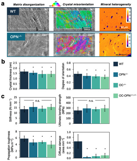 Deficiencies of OPN and OC in bone of knockout mice models. (a) Resolving OPN-deficiency-induced ultrastructural changes in bone using TEM (left), nanobeam electron diffraction (middle), and qBEI imaging (right). Figures reprinted from [36,81], with permissions from Elsevier. (b) Quantitative analysis on the bone ultrastructure, i.e., mineral crystal thickness and orientation, in WT, OPN−/−, OC−/−, and OC-OPN−/− mice. Degree of orientation, the so-called ρ-parameter, is calculated from SAXS patterns. Figures are replotted using data from [65]. (c) Mechanical properties of bone in WT, OPN−/−, OC−/−, and OC-OPN−/− mice: stiffness, ultimate bending strength, propagation toughness, and diffuse damage upon fatigue. Figures are replotted using data from [60,72]. Asterisk * indicates a statistically significant difference compared to WT, with p < 0.05. n.s. = not significant.