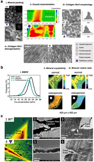 Despite decades of progress, the underlying ultrastructural anomalies in osteoporotic bones remain largely undefined. Osteopenia, which is characterized by significant bone loss before osteoporosis, does not necessarily lead to an osteoporotic state. Nevertheless, relevant genetically modified animal models do not typically differentiate between osteopenia and osteoporosis as they are phenotypically similar. Furthermore, additional work is needed to elucidate whether there are unique changes in the nanostructure and chemistry of bone associated with postmenopausal (ovariectomy-induced), steroid-, or glucocorticoid-induced versus senile osteoporosis, which would require ultrastructural imaging and analysis of the same features in multiple subtypes of osteoporotic samples. Complications arise when there are other underlying conditions as a large number of molecular, genetic, and environmental factors can contribute to osteoporosis pathogenesis [139,140]. Therefore, genetically engineered animal models might be more suited for decoupling the effects of these factors before pinpointing nanoscale changes in biopsy samples from osteoporotic patients. The perspectives offered in Section 2.3 on correlative imaging-nanomechanical testing are also applicable to study the in-situ deformation behavior of (hydrated) osteoporotic bone at the ultrastructural scale.