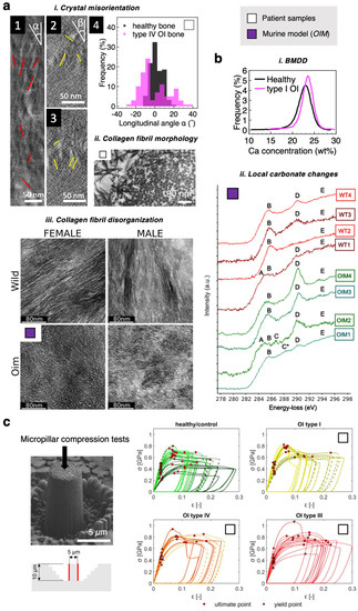 Altered bone structure, chemistry, and micromechanics in osteogenesis imperfecta (OI) pathology. (a) Ultrastructural changes: (i) TEM images showing (1) a single collagen fibril and (1–3) its intrafibrillar crystals in a type IV OI patient bone. The distribution of the longitudinal angle α of the crystals is plotted in (4). For reference, corresponding data for healthy bone from [150] are plotted. Figures reprinted from [146]. (ii) Altered fibril morphology in type III OI patient bone. Figure reprinted from [147], with permission from Wiley. (iii) TEM images comparing the collagen fibril organizations in WT and OIM bone. Figures reprinted from [32], with permission from the American Chemical Society. (b) Chemical changes: (i) Shifted bone mineral density distribution (BMDD) curves, indicating slight hypermineralization compared to healthy human bone. Figure is replotted using data from [136]. (ii) Nanoscale changes in the carbonate content of minerals in OIM bone. Spectra reprinted from [32], with permission from the American Chemical Society. For detailed spectral interpretation and peak assignment (labeled A–E), readers are referred to the original paper [32]. (c) Micromechanical properties of healthy vs. OI bone under compression using micropillar samples. Compressive strength of bone was found to increase with OI severity. Figures reprinted with permission from [46].