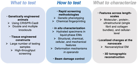 Understanding bone pathologies at the nanoscale requires high-resolution imaging and nanoanalytical techniques. In an ideal scenario, samples should not undergo any harsh preparation protocol in order to retain their native physiological state. When investigating the fracture mechanism of diseased bone, the majority imaged the bone samples before and after mechanical testing, or ex situ, to infer the deformation mechanisms. Some employed scattering techniques to help monitor in situ strain at the fibril level without the ability to directly visualize the deformation processes [162]. For direct imaging, the bone samples were typically in dry conditions due to the high-vacuum environment of the traditional EM sample holder. Therefore, it is difficult to directly correlate the role of water with its structure and mechanical features at the micron scale or below. In-situ deformation behavior of pathological bone during fracture thus remains largely unexplored, rendering the establishment of structure–mechanical properties of diseased bone tissue difficult. Additionally, through reviewing the literature on current bone repair strategies, there is also a paucity of evidence on mineral–collagen ultrastructural changes in treated bone. These present fertile grounds for further research. Figure 6 schematically illustrates some research perspectives in understanding bone pathologies, also applicable to treated bone, starting at the nanoscale: these areas are broadly classified into “what to test”, “how to test”, and “what to characterize”.