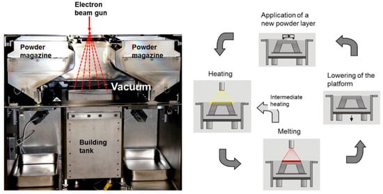 It must be mentioned that the process works in “controlled vacuum”, i.e., the chamber is pumped to approximately 10−4 to 10−5 mbar before helium is inserted to reach a low pressure of about 10−3 mbar, to prevent electrostatic charging []. Electrons are emitted from a tungsten filament or a LaB6 cathode and, as in scanning electron microscopy, are accelerated and focused using electromagnetic lenses []. The object is built in layers of typical thicknesses between 0.05 and 0.15 mm. Generally, a new powder layer is preheated to temperatures between 300 and 1100 °C for different metals to start sintering, e.g., to around 400 °C for pure copper and 900–1100 °C for Ti–48Al–2Cr–2Nb powder [,], in this way increasing the electrical conductivity and thus avoiding repulsion of charged powder particles [], then melted where desired, lowering the platform, applying a new powder layer of defined thickness on the platform, and starting with the next preheating step. Literature reports indicate that selective electron beam melting results in relatively coarse surfaces and internal microstructures [], but on the other hand in low residual stress [].