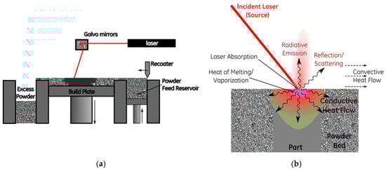 (a) Typical SLM or SLS process; (b) heat transfer paths in melt pool formation and solidification in an SLM process. From [], originally published under a CC-BY license.