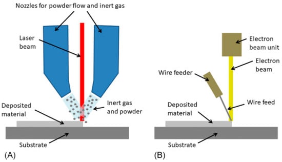 Schematics of two directed energy deposition (DED) systems: (A) DED system using laser with powder feedstock; (B) DED system using electron beam and wire feedstock. Reprinted from [], with permission from Elsevier.