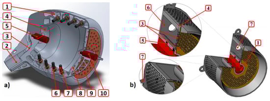 (a) Free design for maximized thruster performance; (b) design taking into account realistic additive manufacturing limitations. (1) Aluminum chamber, (2) connecting point importing the propellant, (3) channels guiding the gas, (4) gas exit, (5/10) hollow cathode for plasma generation, (6) electromagnet copper coil, (7) electromagnet iron core, (8/9) exit grids. From [], originally published under a CC-BY-NC-ND license.
