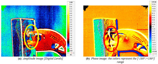 Thermoelastic stress analysis results revealing the location and the sign of the stress concentrations in a metal bracket for satellites. Reprinted from [], with permission from Elsevier. (a) Amplitude image (digital levels); (b) phase image, the colors represent the range (−180°, +180°).