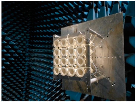 Gill et al. used direct metal laser sintering of AlSi10Mg to prepare antenna feed arrays for the Ka band based on high-efficiency horns, which are typically used as feed elements in high-throughput satellites using multibeam antennas []. The antenna feed array constructed according to typical limitations of 3D printing, such as reduced use of support that can easily be removed by machining, rounding off sharp corners, etc., is depicted in Figure 8, mounted on a plate for tests in an anechoic chamber. The authors successfully performed RF tests at 27–30 GHz and found a first natural frequency of 502 Hz, which is in the correct range for space payload systems. Furthermore, mechanical tests showed adequate results, making such antenna feed arrays suitable for communication satellites.