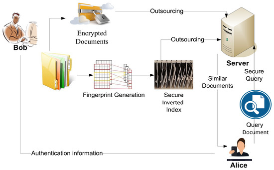 Upon receiving the secure fingerprint of the document Q from Alice, the server S matches the provided fingerprint against its secure index and then responds to Alice by the scores which represent the matching score for all the stored m documents. Finally, Alice downloads the top-h documents. Figure 1 shows the structure of the proposed work.