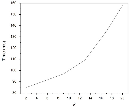 The construction of the secret inverted index by the data owner, Bob, included generating the fingerprints and encrypting the posting vectors. In this experiment, the effect of the collection size, m, and the k value for the k-gram on the secure inverted index building time and the total number of individual fingerprint terms is illustrated. Figure 4 shows that increasing k when computing the k-gram sets provokes an increase in the fingerprint terms. Similarly, increasing k requires more time to compute the fingerprint terms, as explained in Figure 5.