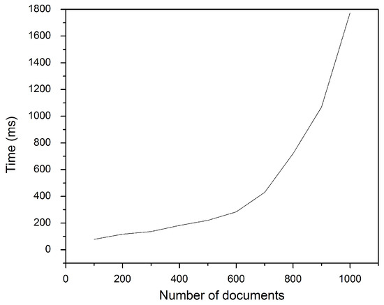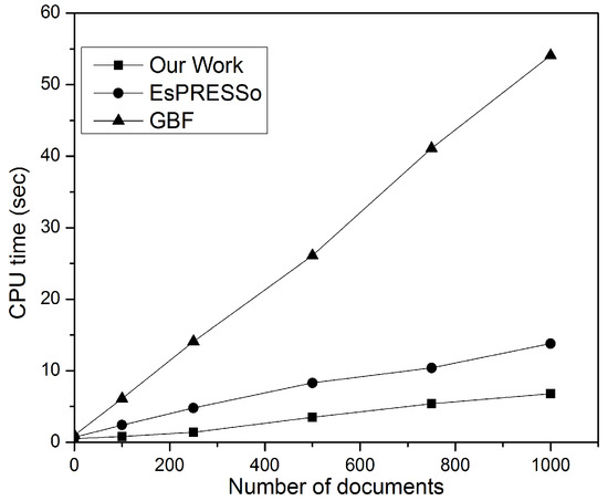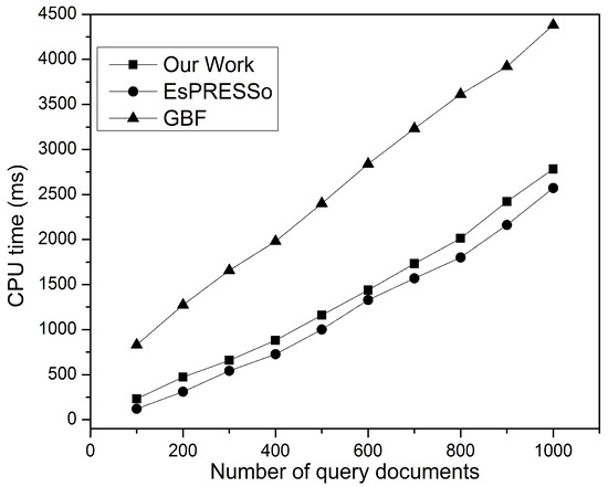 Figure 12 shows the privacy-preserving DSD performance. A single document was compared with the document collection consisting of m documents. The results of the comparison show that all methods have m linear complexity. Of the three methods trialled, this study returned the best performance; the method proposed in this study improves the cost speed of document retrieval with O(1) access time based on the inverted index [20,21], which includes a set of fingerprint items and their corresponding posting lists. While EsPRESSo performs slightly less efficiently in this regard as long as it uses a Min-Hash function, it is inefficient in retrieving scalable documents, as noted later. GBF returned the worst performance, since it is modelled for computation of big set intersections and requires an oblivious transfer (OT) [43] to compute the similarity between two documents.