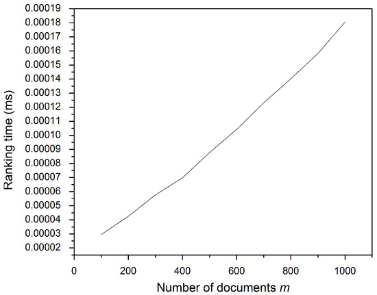During the ranking time, the study sums up the posting vectors of the matched fingerprint terms. All vectors are of a fixed length equal to the collection size m. Figure 8 shows that more matched fingerprint terms require a longer ranking time. The document collection size for this experiment was fixed at 1000. Meanwhile, Figure 9 illustrates that increasing the posting vector requires more ranking time since longer vectors require more time to be added. From the foregoing, the time taken to rank files no longer affects the file retrieval process, as it is of intangible value (0.00019 ms) for the overall performance of the scheme and the client response time.