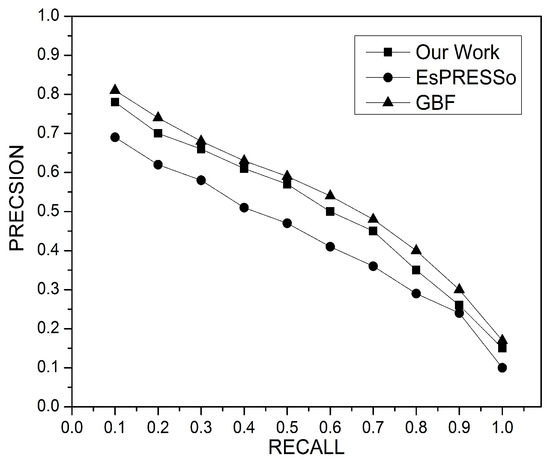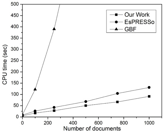 The following experiments compare the performance of the proposed work with AEsPRESSo and GBF in terms of precision and recall, as shown in Figure 11. The precision and accuracy are formulated as in Equations (4) and (5). GBF has the best overall effectiveness because it employs the full set to represent each document; however, this results in a very expensive computational cost, as noted in previous experiments and shown in Figure 12, Figure 13 and Figure 14. The effectiveness of this paper’s model is slightly lower than GBF since it uses a Winnowing algorithm that extracts and selects the fundamental property from a fingerprint set to reduce terms that represent documents. The selection of only the most important and effective fingerprint has led to a reduction in computational complexity. The AEsPRESSo model has the least effectiveness for precision and recall due to the precision loss in the Min-Hash that is used to represent and measure the similarity between two sets. This paper concludes that the accuracy of precision is highly sensitive to the way documents are represented.